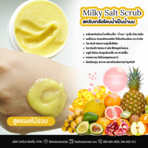 สครับเกลือพร้อมการบำรุงจาก สารสกัดผลไม้รวม อุดมด้วยวิตามินตามธรรมชาติ เมื่อสัมผัสน้ำ เนื้อสครับจะเปลี่ยนเป็น “น้ำนม” เนียนละมุน